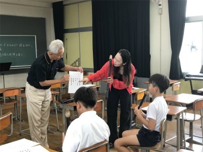 「橋っ子音楽会」に向けて4年生は日々合唱や合奏の練習をしています。市政20周年を記念しての音楽会となるため、辻本氏とともに尺八の演奏をします。その練習を行いました。初めて水道管尺八で音を出しましたが、上手に音が出ていたので、ほめていただきました。本番はどんなハーモニーになるのか楽しみです。