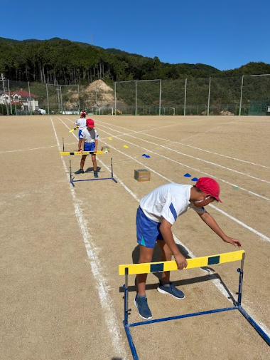 走り幅跳びとハードル走を、踏切足に気をつけながら一生懸命に練習しています。
