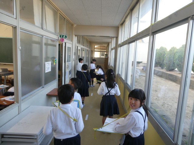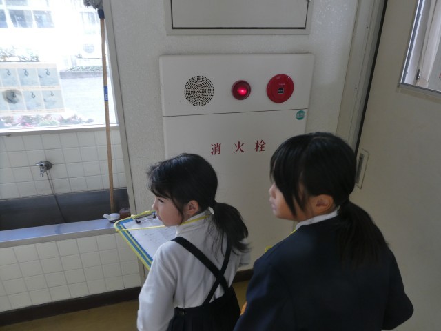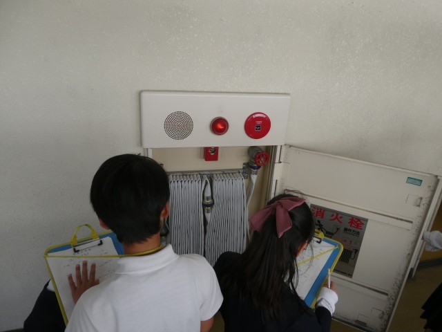 3時間目の社会の時間に、学校にある消防設備の探索を行いました。各教室に火災報知器があることや、各階に消火器や消火栓があることを見つけ、火事が起こった時のことをきちんと想定されいることに気づくことができました。また、消火栓の中を見る機会もあり、「こうなっているんだ」と興味津々で中をのぞく子どもたちの様子も伺えました。