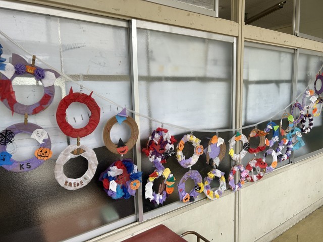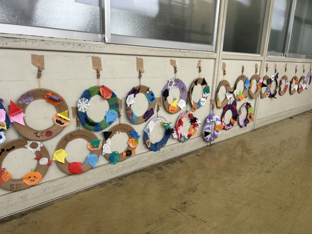 またハロウィンリースも作成し、廊下がハロウィンらしく、華やかになりました!