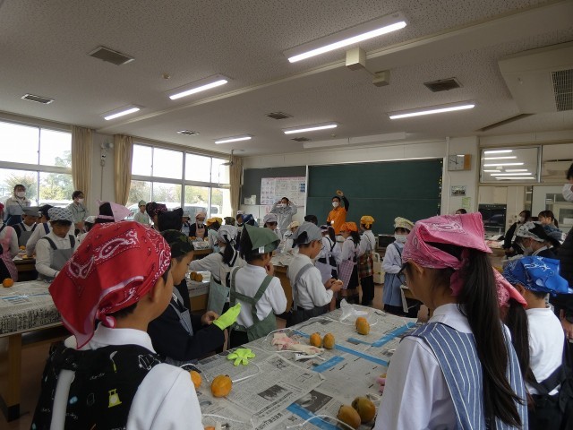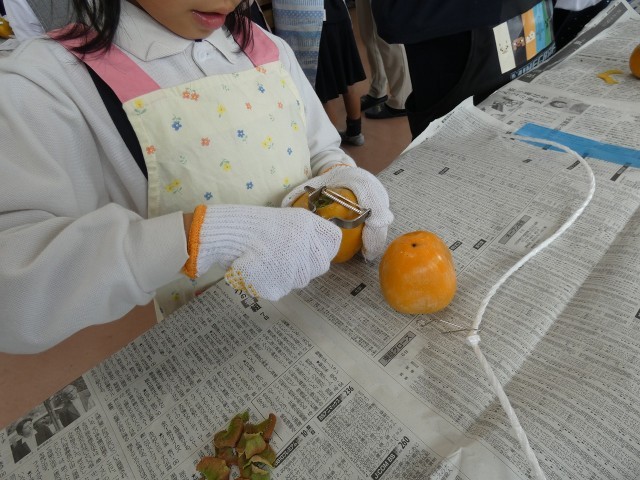 3年生は、吊るし柿の実習をしました。3時間目に橋本市の名産である柿についてお話を聞き、早速作りました。ピューラーでうまく皮を向いていました。紐につるして約1か月ほど吊るすと甘い柿になるそうです。楽しみですね。