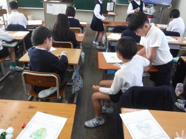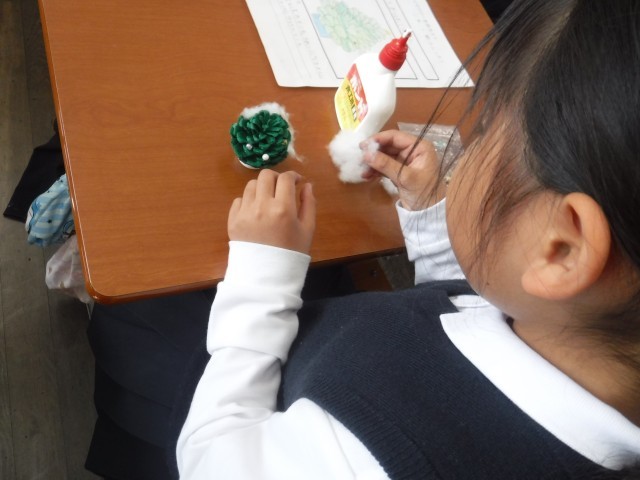 今日は自分の下書きをもとに、まつぼっくりツリーにわたをつけ完成させました。