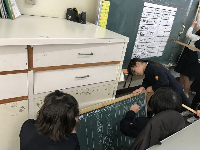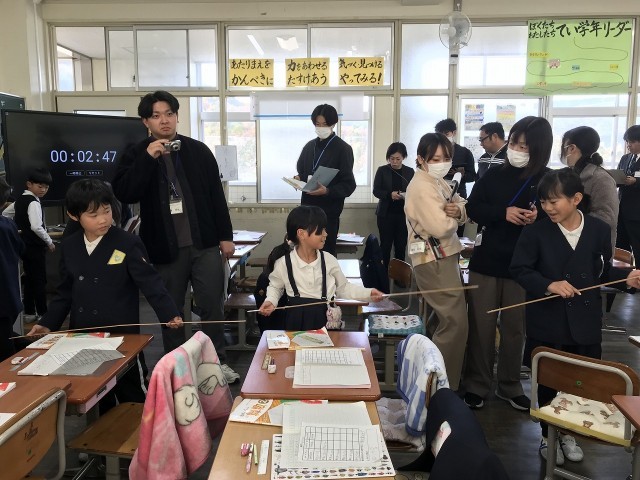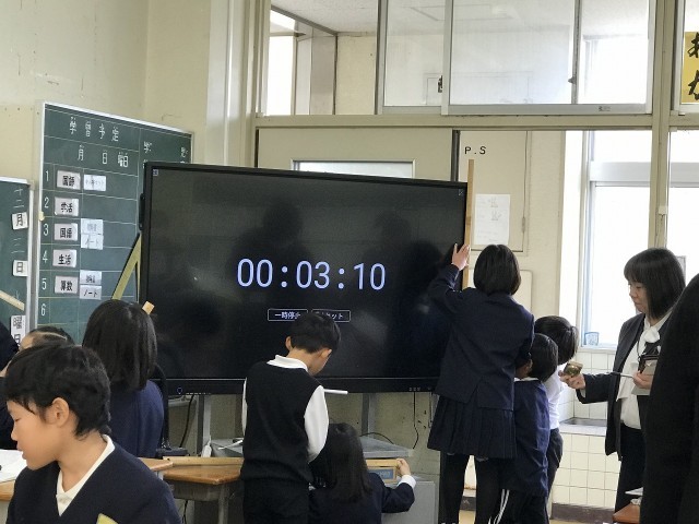 2年生の研究授業があり、教室の長さや黒板の長さなどを予想して測りました。1mの量感を手で表している子もおり、実際の測定値に近い予想も出ました。一生懸命に子どもたちは考えていました。