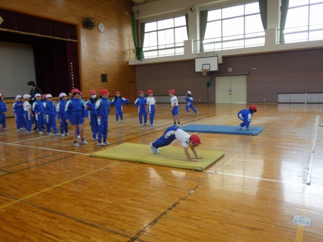 2年生は、跳び箱とマット運動です。手の力をしっかり使って運動していました。