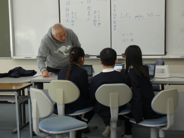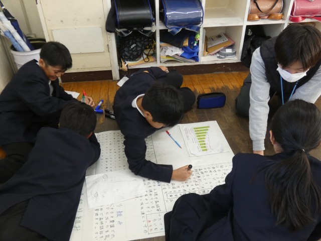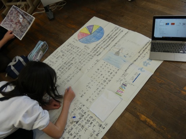 また、総合的な学習の時間には、学習発表会で発表するまとめについて、グループで練習していました。5年生にもなると、ただ説明するだけでなく、「相手に分かってもらえるように」説明しようとがんばっていました。