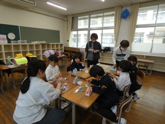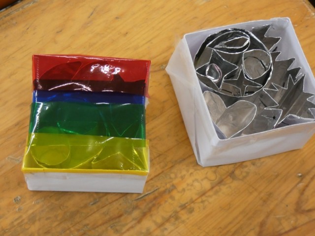 2年生の子どもたちが、ふれあいルームの先生からきらきらキューブの作り方を教えていただきました。銀紙で星などの形をつくり、その上にセロファンをかぶせます。光にかざすととても綺麗です。