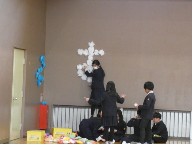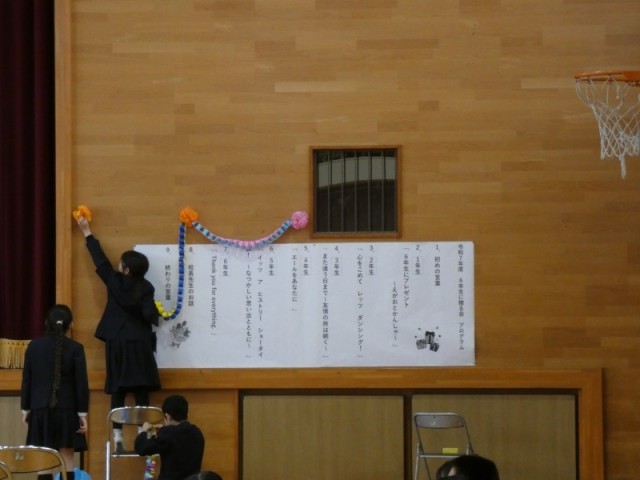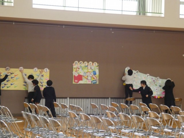 明日の6年生に贈る会に向けて各学年が準備しています。5年生は、この会に向けての企画、運営を担います。本日は会場設営です。各学年からのメッセージを貼ったり、椅子を並べたり、確認したりと大忙し。