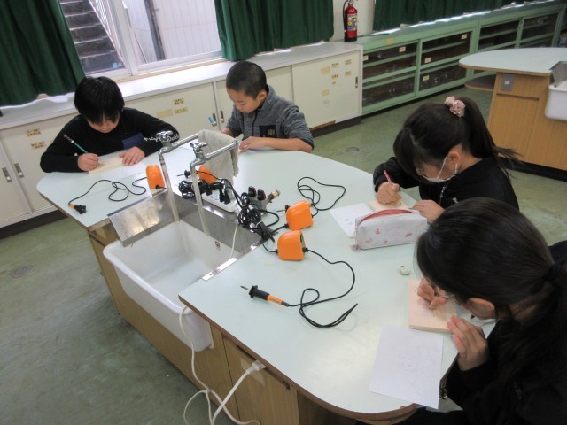 ウッドバーニングでは自分たちの好きな絵を木の板に書くことができました。