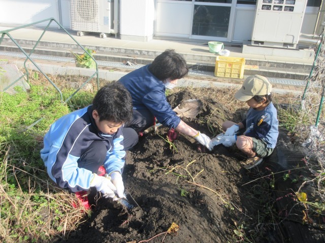 1年生は小学校では、初めての芋ほり。つるの下に手探りでスコップを入れ、お芋が見つかると「あった!」と大喜び。お芋の周りを丸く手やスコップでかいてがんばりました。片付けもすすんで手伝い、先生の大きなシャベルの使い方を見て、シャベルに「足をかけてどう掘るの?」と興味を持っていました。