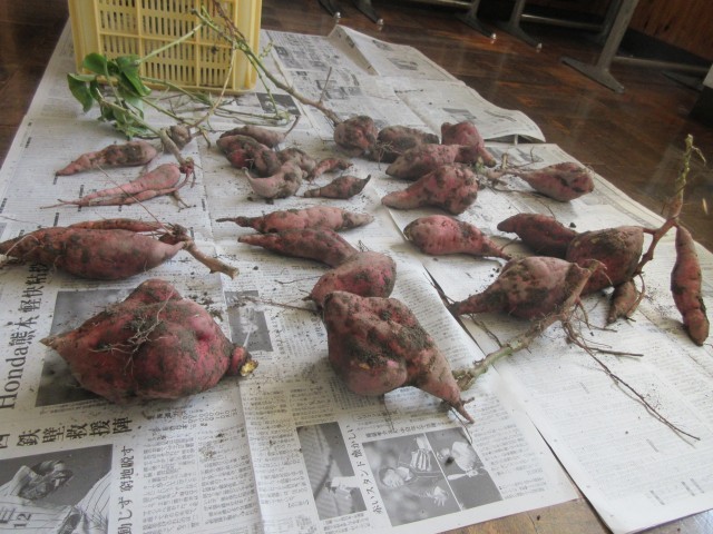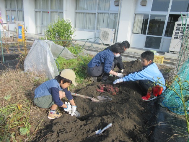 4年生は、芋を傷つけないように気をつけながら、どんどん掘り進め、よい見本となってくれました。つるや道具の片付けに加え、夏野菜の支柱の片付けも、てきぱき動いてくれて助かりました。