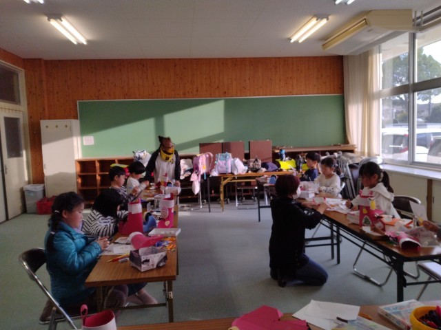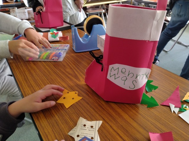 金曜日、サンタブーツの工作が出来ました。ちょっとややこしい部分があるのですが、説明をしっかり聞いて、周りのサポーターさんに確かめながら皆自分で取り組めました。形が出来上がると白い紙に思い思いの絵を描いて切り抜いて貼り付けて出来上がりです。