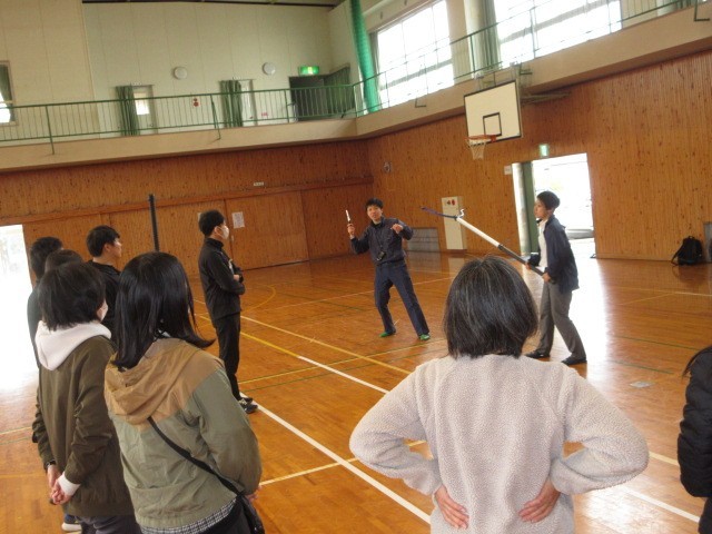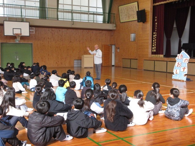 訓練終了後、体育館で、自分の身を守る大事なお話をいただきました。また、職員も対応方法について、ご助言をいただきました。