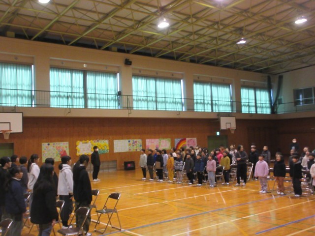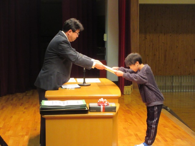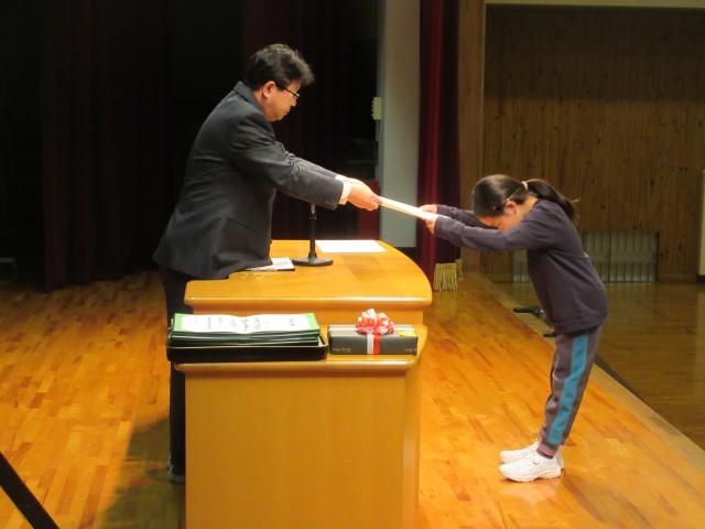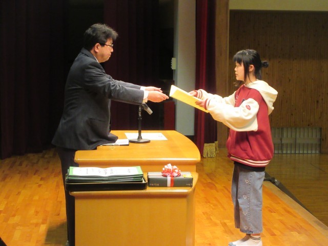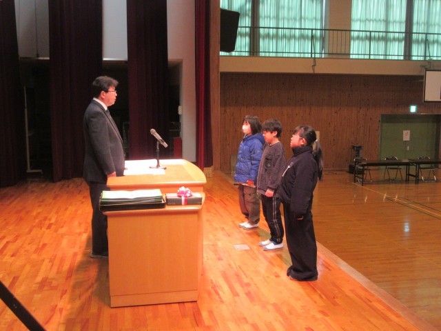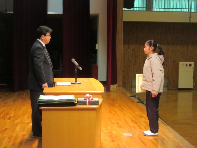 森脇慶一郎善行褒賞・田中久美子すこやか褒賞を受賞した6年生のお姉さんを紹介しました。