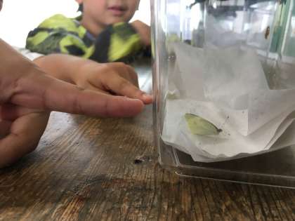 教室で飼育しているモンシロチョウのさなぎから第1号のチョウが誕生しました。