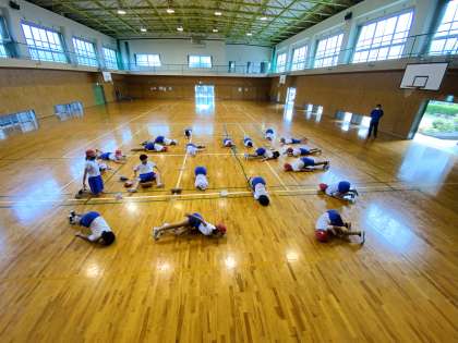 今日の体育の時間は、BCエクササイズで体をほぐした後、班別の表現運動の練習をしました。