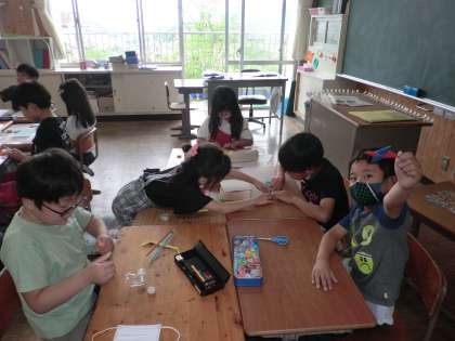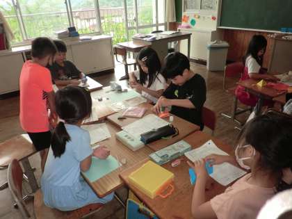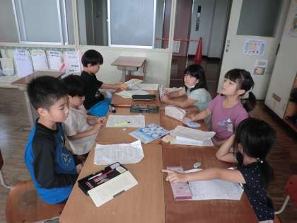 各教室の説明の紙をドアのところに貼りに行ったり、誰がどこを読むのかを班の中で話し合ったり、お土産を何にするか話し合ったり。