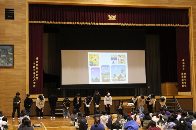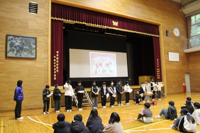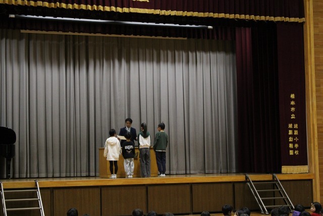 集会では児童の表彰を行った後、図書委員会からクリスマス絵本の読み聞かせがありました。