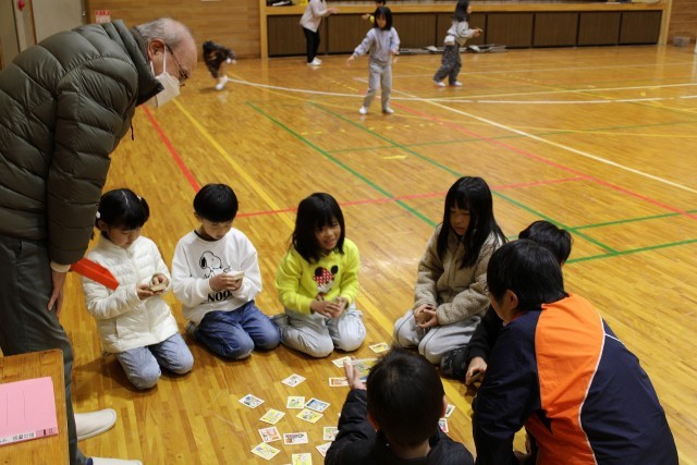 竹とんぼやけん玉、お手玉、こま、あやとり、かるたなどの遊びを地域の方々に教えていただいたり、一緒に楽しんだり終始笑顔で活動することができました。また、今日から紀見東中学校の生徒が職場体験で来てくれており、1年生のお世話をしてくれました。