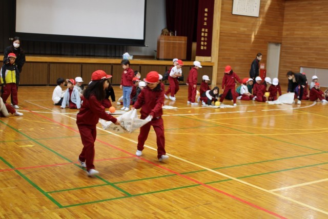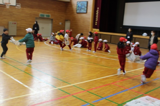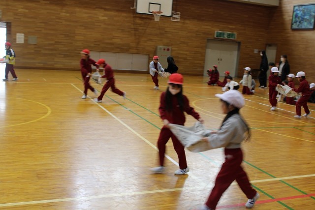 新聞紙の上にボールをのせて2人で運んでいます。