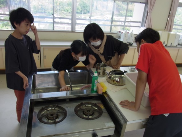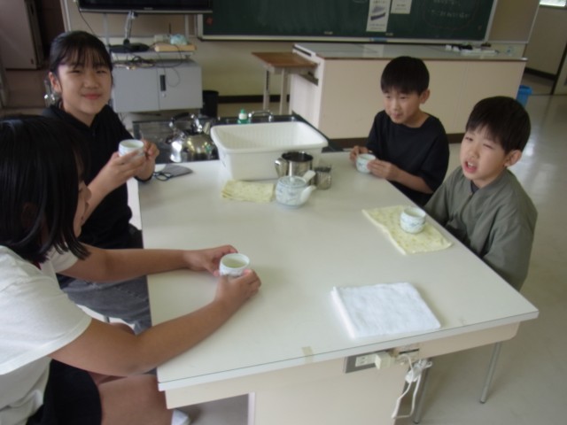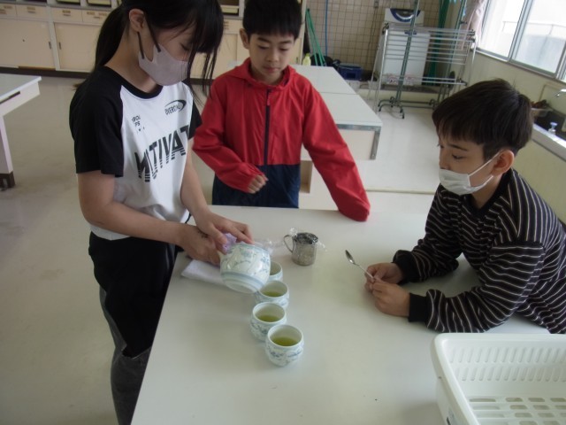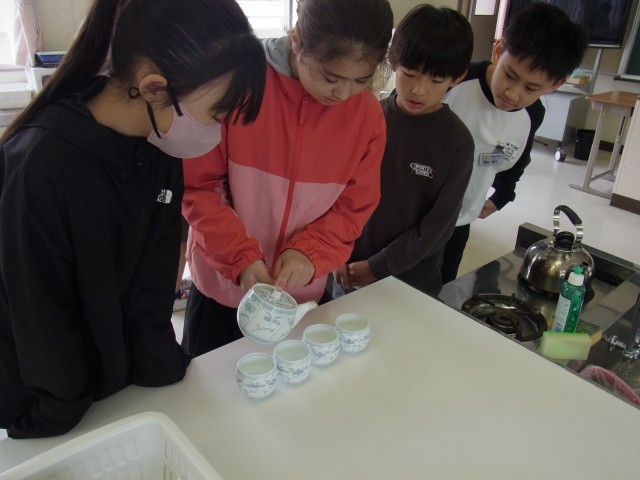 今日は、お湯を沸かしてお茶を入れる実習をしました。急須に茶葉とお湯を入れ、どれも同じ濃さになるように少しずつ注ぎます。どのグループも、上手にお茶を入れることができました。「熱いけどおいしい!」「おかわりしたい!」と、楽しみながらお茶を味わっていました。後片付けも協力してテキパキと行うことができて、素晴らしかったです。