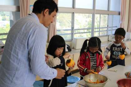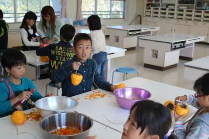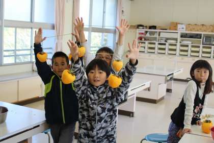 むき終わればひもにつるします。今回のカキは少し大きめです。ひとり2個ずつ作りました。1ヶ月後には美味しく食べられるようです。今から楽しみです。