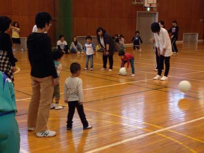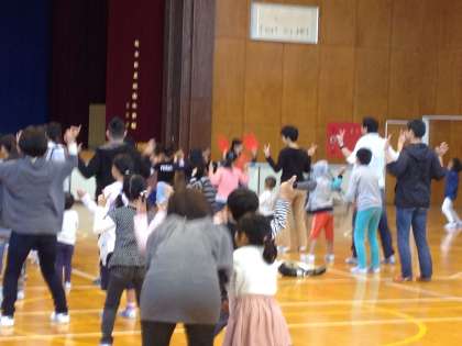 土曜日の午後城山小学校で紀見東中学校区の交流会がありました。『エビ・カニ体操』の後、園児はコロコロドッチ、児童はドッチビーで盛り上がりました。