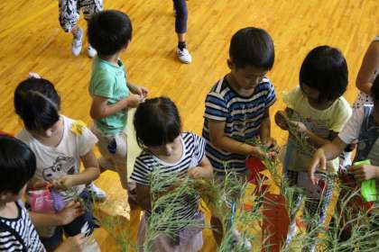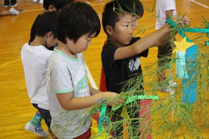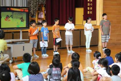 今日2時間目から幼稚園と合同で「七夕集会」がありました。はじめに図書委員が読み聞かせをしてくれました。