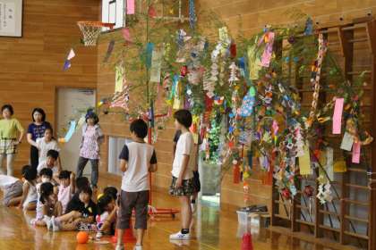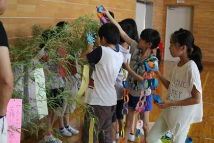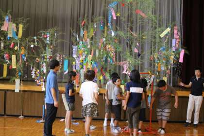 学校運営協議会委員の方にとってきていただいた笹に、たんざくを付け完成です。一番背の高いのが6年生です。