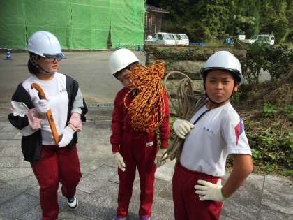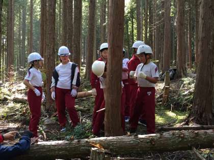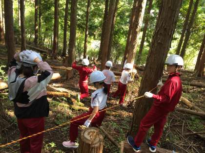 森林体験学習 公開日 2020/10/13 更新日 2020/10/13 授業 間伐体験が始まり、2つのグループに分かれて木を切り倒します。 直径25cmくらいの木を、みんなで交代しながらノコギリで切っています。 いいね(0)