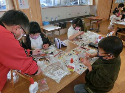 1年生 節分飾り 公開日 2021/01/21 更新日 2021/01/21 授業 3時間目、1年生が「節分飾り作り」を行いました。 各机に児童館の方がついて、作るサポートをしてくれました。 いいね(0)