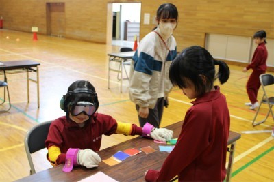 子どもたちは様々な用具を装着したり、車いすに乗ったりして高齢者・障害者の立場にたち、自分たちや学校としてできることは何かを考えました。