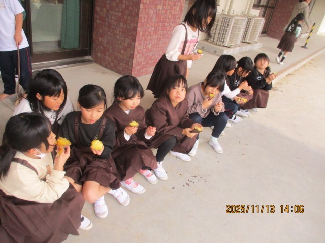 1・2年生でおいもパーティをしました。自分たちで育てたさつまいもと中学校からいただいたものを防災ベンチで焼き上げました。会食の時はエプロン先生も招いて、歌を歌って楽しくわいわい焼き芋をいただきました。甘くてホクホクの焼き芋に「おかわりほしい!」という子どもたちの声が鳴りやみませんでした。