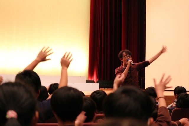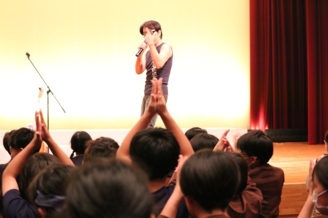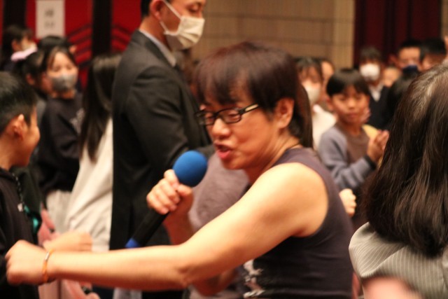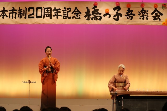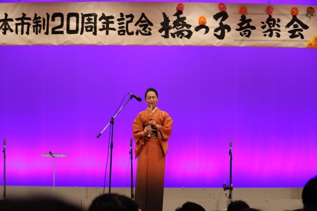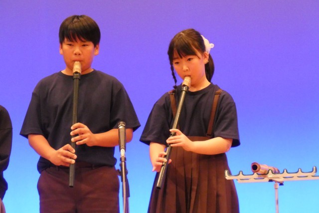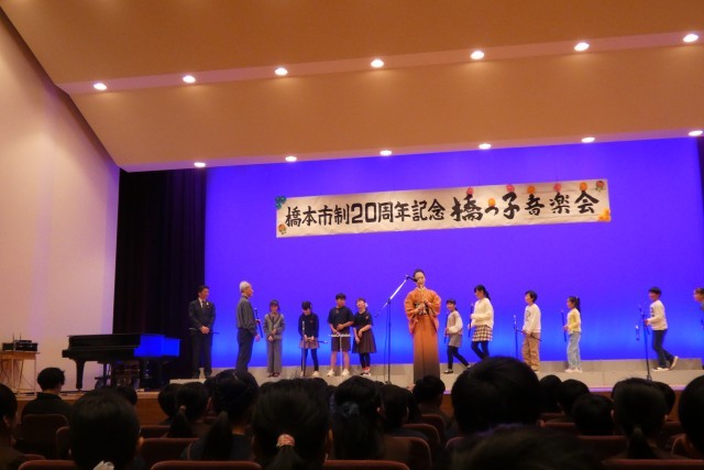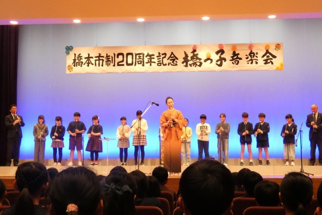 各学校の演奏の後は、橋本市出身のプロの音楽家による、尺八や琴の演奏『辻本好美さんと邦楽家族のミニライブ』やジョーシンのテーマソングでお馴染みの『ウインズ平坂さんのミニライブ』がありました。尺八の演奏時には、本校を代表した2名の児童がコラボ演奏をしました!