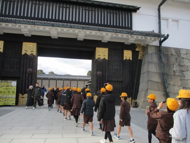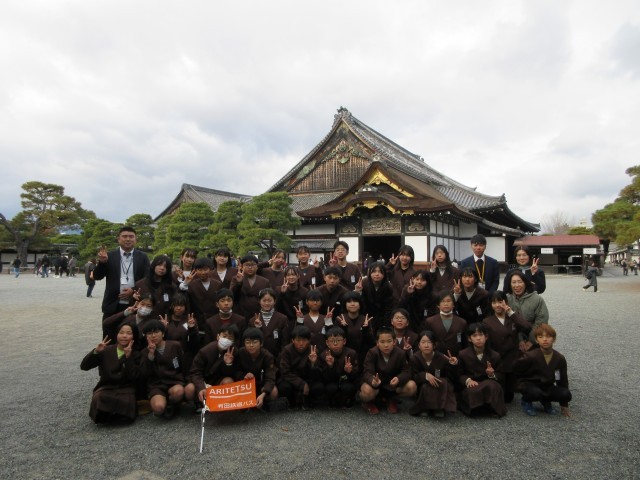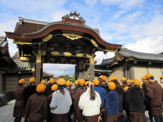 大政奉還の舞台、二条城の見学に行きました。大きな二条城の本丸の中を一周しました。床から音が鳴る鴬張りの廊下や、武者隠しの扉など、ガイドさんからの説明を聞きながら、たくさん学べました。