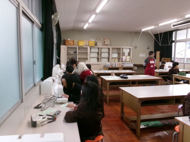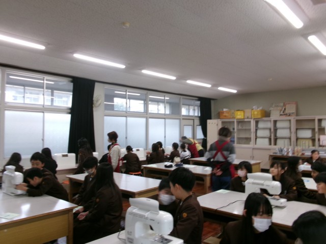 5年生B組のミシン実習に、エプロン先生が来てくれています。