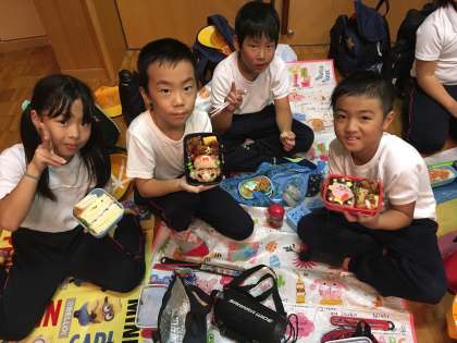 2年生のお弁当タイムの様子です。みんなもりもり残さず食べました!とってもおいしかったよ。ありがとう〜♪