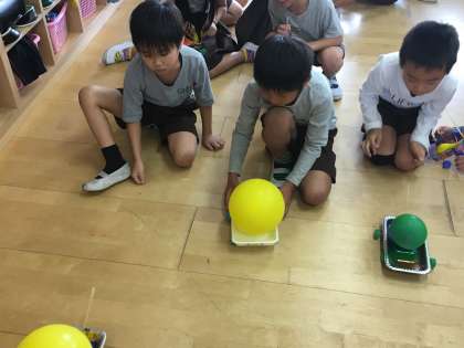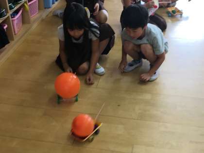 今回は、空気の力で動くジェットカーを作りました。風船を膨らませるのが難しかったので、休憩時間に一生懸命練習した子もいます。お家でもたくさん遊んでみてね♪