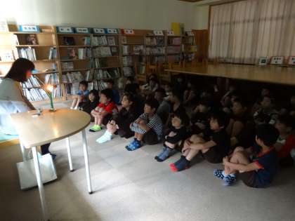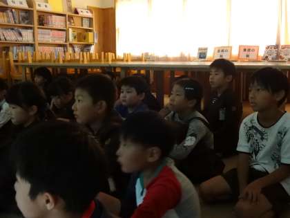 2回目のお話のいす。読み聞かせをしてくれる人の顔を真剣に聞き入る姿やおもしろくて思わず笑ってしまう場面もあり、楽しく聞かせていただきました。