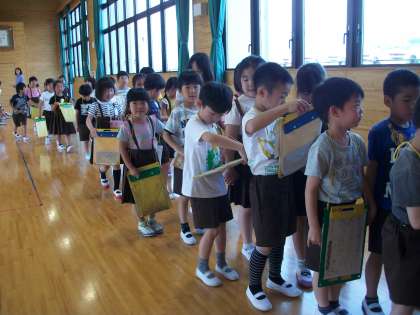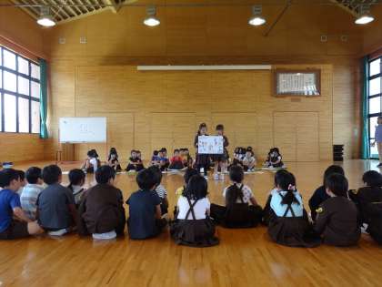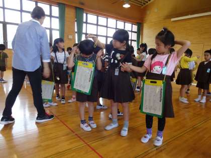 2年生が、なかよし会を開いてくれました。教室の紹介をしてもらったあと、手をつないで一緒に学校探検に行きました。各教室をまわりながら、シールを貼って位置を確かめました。
