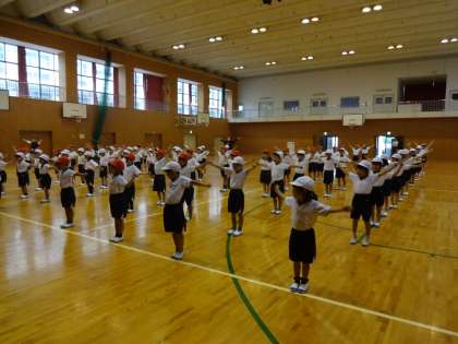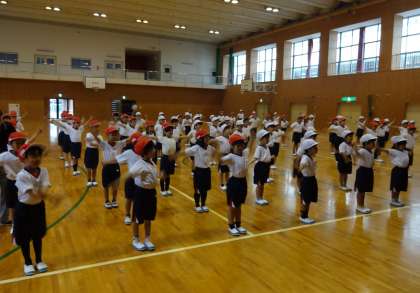 ラジオ体操をしました。CDのかけ声に合わせて、一生懸命体操することができました。
