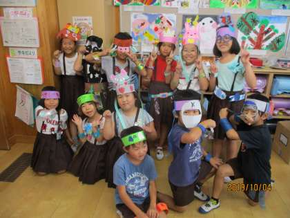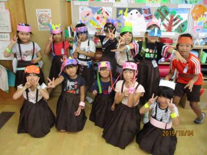 図工で学習していた「わっかでへんしん」が完成しました。作ったものになりきってハイ、ポーズ!