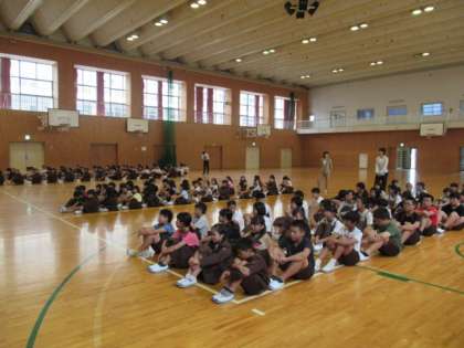 初めに入ってきたのは、2年生と6年生。物音ひとつさせずに、ほかの学級が来るのを待っていました。