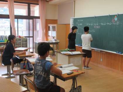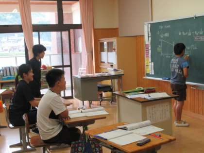 縮図から元の大きさを考えています。黒板を使って説明していましたが、ちょっと困ったので、友達にバトンタッチをして、続きを説明してもらっていました。