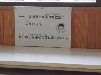 明日からの分散登校で3密を避けるために、1年・3年・5年は多目的室で授業を行います。