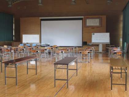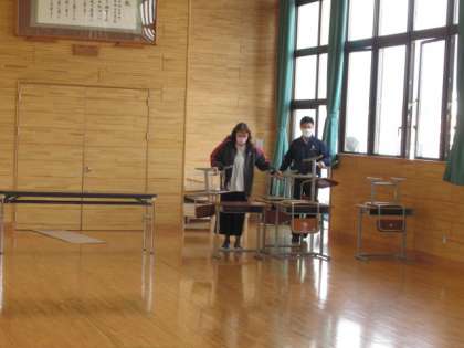 その準備を全職員でしています。2階の3年生の教室から机を運んだり、黒板代わりのホワイトボードを準備したり、プロジェクターやテレビを設置したり・・・・・