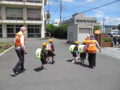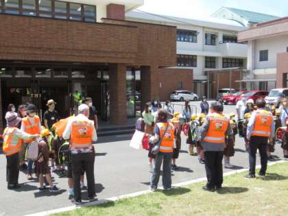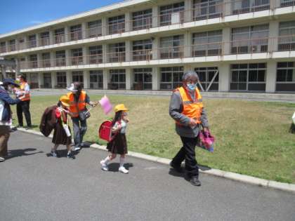 4月と同じように、チームに分かれて帰ります。エプロン先生に見守られて帰ることができるので、安心です。