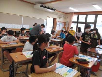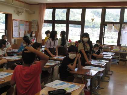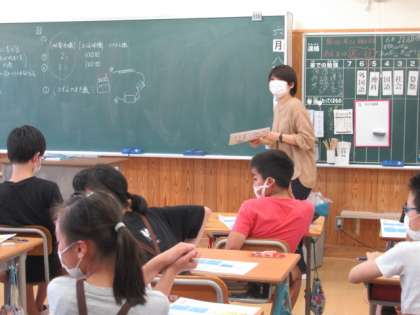 プリントの答え合わせをしています。難しいところがあり、わかる子に説明してもらいます。立っている子がわかっている子、みんな教えてもらいに行こう!