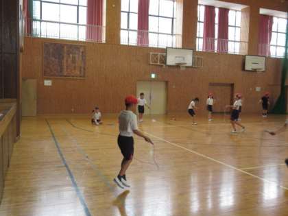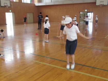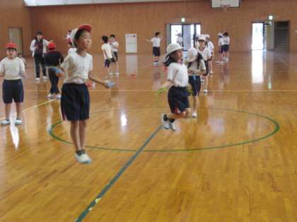 縄跳びをしていました。先生がいろいろな跳び方を次々言います。その跳び方をみんなが練習していました。二重跳びができるようになって喜んでいる子もいました。
