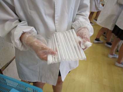 給食当番は、ナイロン手袋を着用して、配膳します。