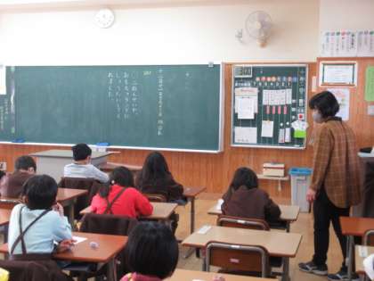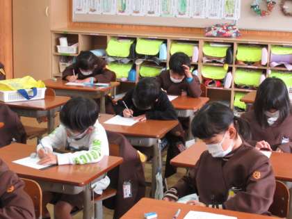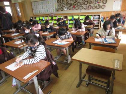 2年生に招待してもらったおもちゃランドで、楽しかったことを絵日記に書いています。書き出しは先生の文章をお手本にしていますが、続きは自分で書きます。みんなとっても楽しかったようで、どんどん鉛筆が進んでいました。